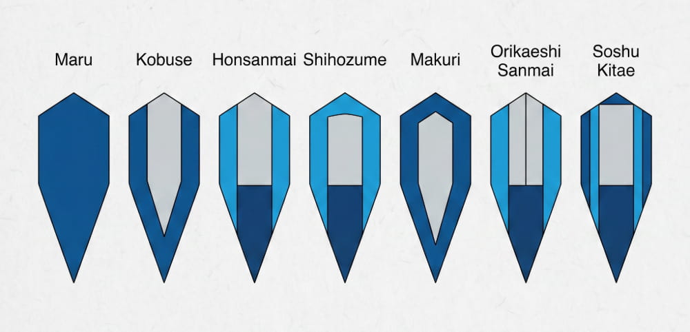 Japanse smeden hebben daarom verschillende interne constructies ontwikkeld om de kwaliteiten van meerdere staalsoorten in één enkel lemmet te combineren. Afhankelijk van de gekozen structuur kan het harde staal zich aan de snede bevinden, een zachtere kern omhullen of over meerdere lagen verdeeld zijn. Het doel blijft altijd hetzelfde: een zwaard creëren dat efficiënt kan snijden en tegelijkertijd duurzaam blijft.