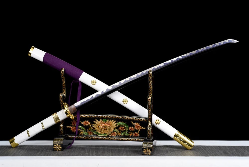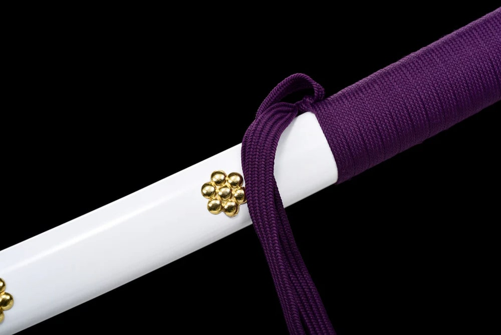 Dompel jezelf onder in de epische wereld van One Piece met dit uitzonderlijke katana, geïnspireerd door het iconische personage Oden Kozuki. Een paars lemmet, met kleiharding en op traditionele wijze met de hand gesmeed, maakt van dit katana een stuk waar elke manga jaloers op zou zijn. De witte schede is gemaakt van leer met een houten kern, terwijl de verfijnde tsuba bestaat uit een koperlegering. De vervaardiging van dit katana is uiterst zorgvuldig en volgt de eeuwenoude regels van de Japanse zwaardkunst.