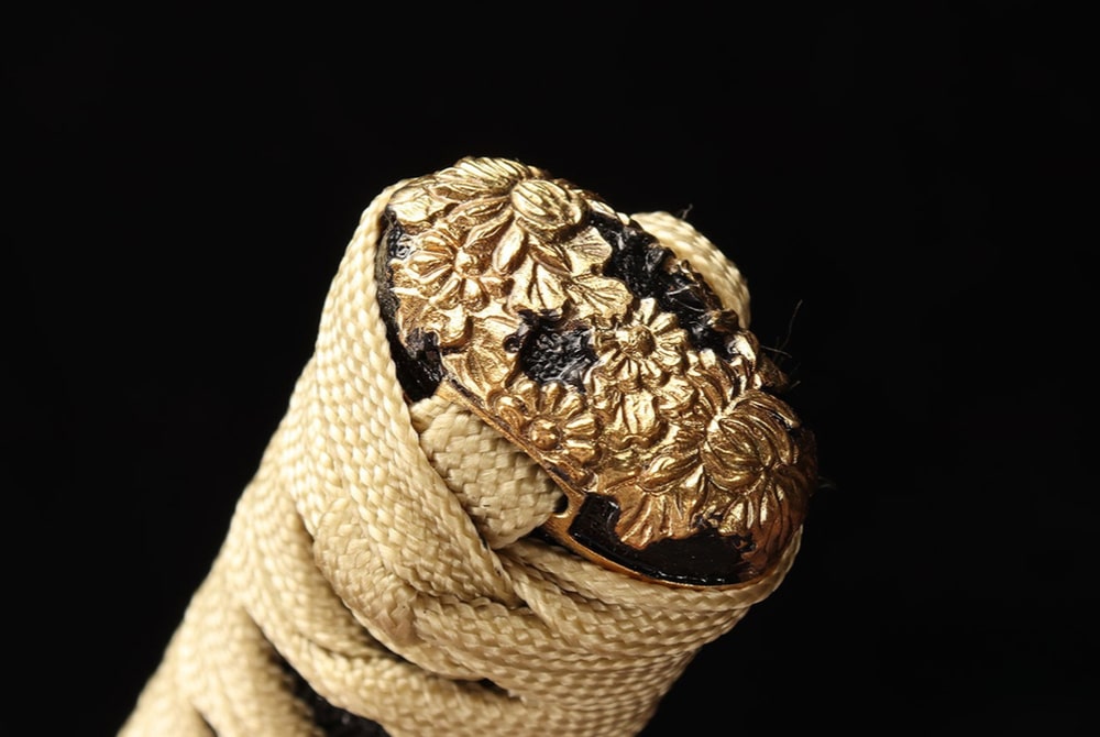 De saya (schede) van de Hikari no Bushido Katana is een kunstwerk op zich, vervaardigd uit zeldzaam en exotisch hout. Met de hand gebeeldhouwde elementen van buffelhoorn sieren de saya en voegen een vleugje verfijning toe aan het strakke ontwerp. De diepe zwarte kleur van de saya contrasteert met de glans van het lemmet en creëert een ongeëvenaarde visuele harmonie. Het handvat van de katana is een symbool van ergonomische perfectie. Bekleed met authentieke roggehuid biedt het een stevige en comfortabele grip. De Japanse zijde die eromheen is gevlochten, is met millimeterprecisie aangebracht en weerspiegelt de toewijding aan traditioneel vakmanschap. Elk detail van het handvat is een ode aan verfijning.