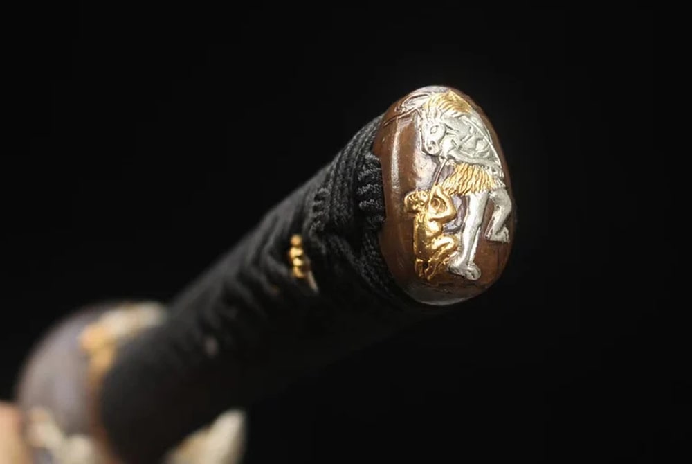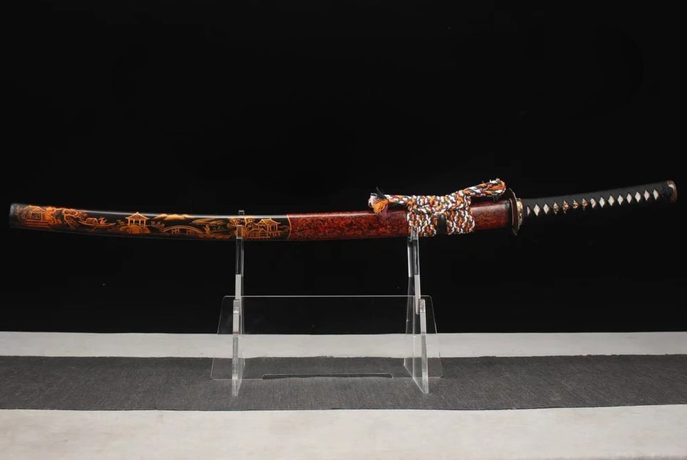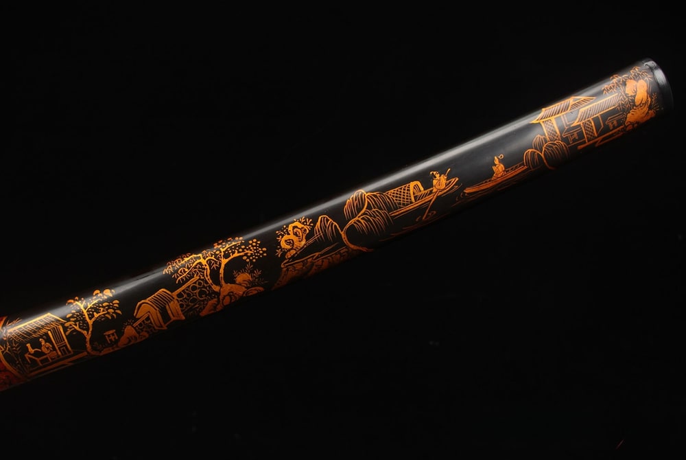 Het handvat van de katana is bekleed met echte roggehuid en strak omwikkeld met Japanse zijde, wat een grip biedt die doet denken aan de gratie van bloeiende kersenbloesems. Afwerkingen in echt zilver en goud voegen een vleugje schittering toe aan dit martiale instrument. De saya van de Mura no Hogo Katana is een waar kunstwerk, versierd met Japanse schilderingen die het verhaal van het dorp vertellen. Dit object overstijgt het gewone zwaard en wordt een bewaker van traditie en erfgoed.
