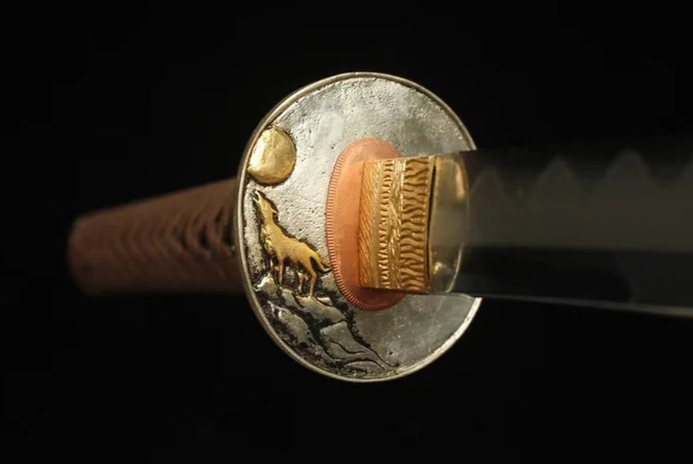 Dit katana is een uitzonderlijk stuk dat traditie en elegantie verenigt. Het damaststalen lemmet wordt met de hand gesmeed volgens eeuwenoude technieken. De saya heeft een traditionele amberkleur die doet denken aan oude Japanse katana’s. De tsuba, versierd met een wolf onder de maan, symboliseert loyaliteit en kracht.